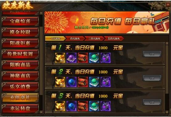 2.连续充值达到3天,奖励翻倍领,更可领取暗影晶石、地狱晶石、雷霆装备等贵重物品