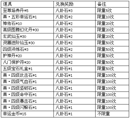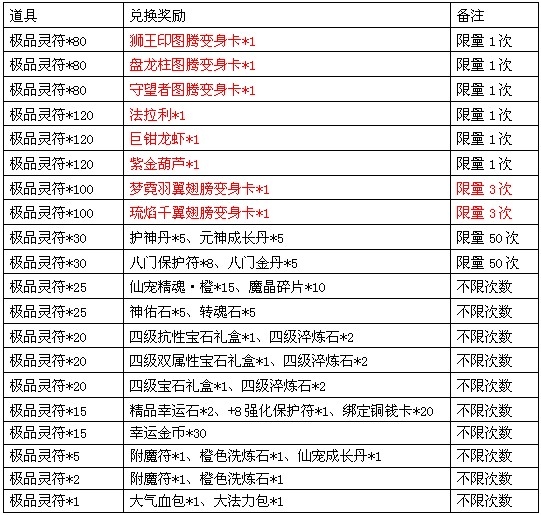 兑换列表如下: