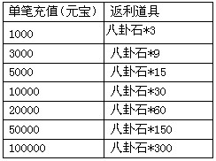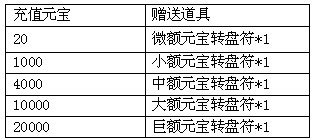 活动期间,玩家充值至指定额度,即可获得对应的元宝转盘符,使用元宝转盘符转动转盘,将可随机获得转盘上任意额度的元宝奖励。每个额度转盘只能转一次,每一轮转完之后将开启下一轮转盘。元宝转盘升级后,最高可累计获得30520非绑定元宝返利哦!