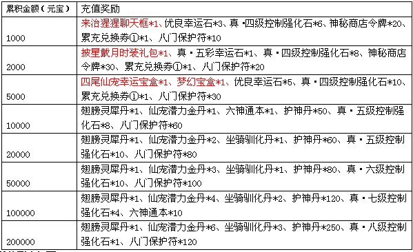4、累积充值大礼:活动期间,累积充值达到指定额度,还可以获得以下超值丰厚的奖励哦!