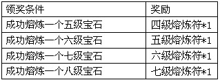 活动规则:活动期间,玩家每熔炼成功一个指定级别宝石,即可获得系统赠送的好礼一份。