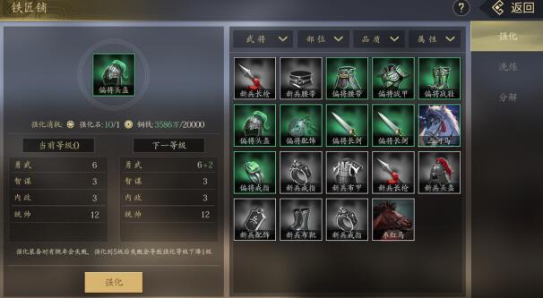 玩家可以在城池内的铁匠铺将装备进行强化,强化后可以获得强化属性(强化装备主属性,不影响武将的星级加成)。
