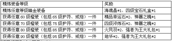 活动规则:活动期间,玩家通过橙装精炼获得任意一件橙装(包括橙色武器)或精炼成功任意暗金装备,即可获得系统奖励一份。