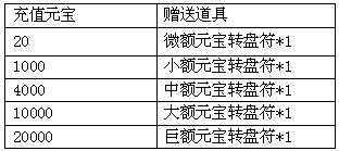 活动期间,玩家充值至指定额度,即可获得对应的元宝转盘符,使用元宝转盘符转动转盘,将可随机获得转盘上任意额度的元宝奖励。每个额度转盘只能转一次,每一轮转完之后将开启下一轮转盘。元宝转盘升级后,最高可累计获得30520非绑定元宝返利哦!