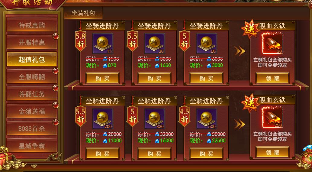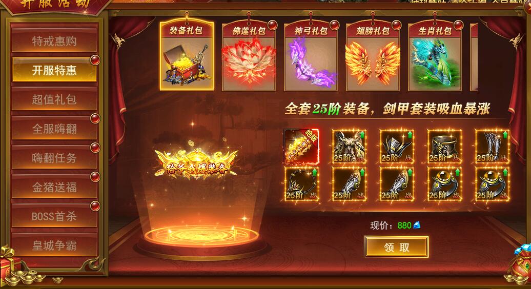 购买礼包战力飙升,打怪轻松等级狂飙。礼包有:装备礼包、佛莲礼包、神弓礼包、翅膀礼包、生肖礼包、神剑礼包、宝石礼包