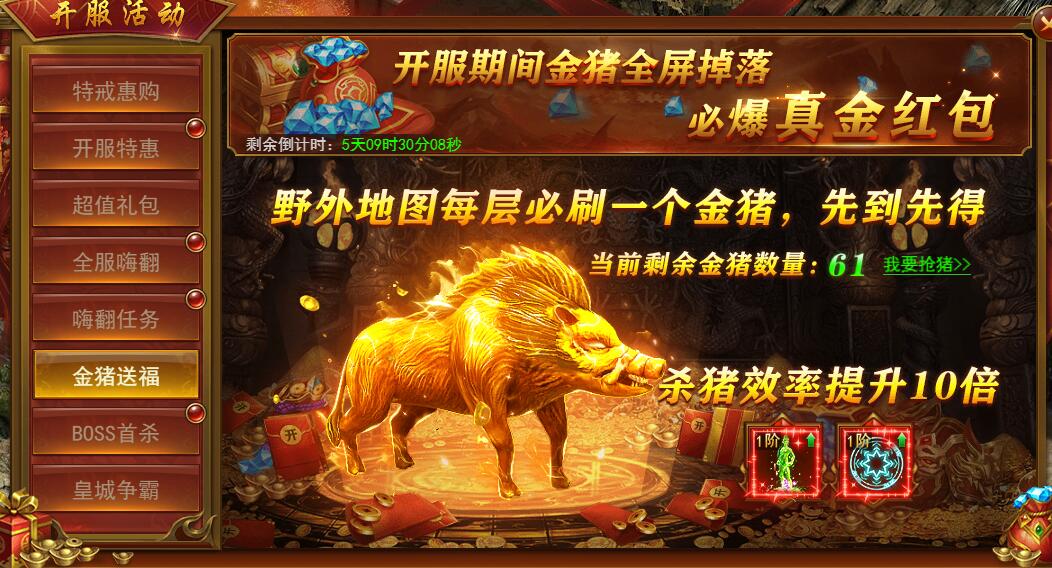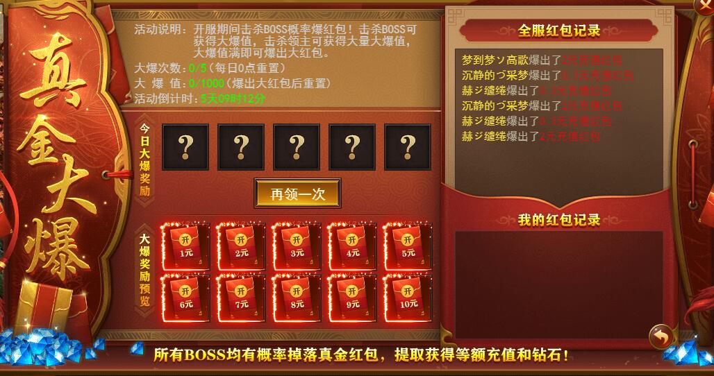 开服活动期间击杀boss概率爆红包,击杀boss可获得大爆值,击杀领主可获得大量大爆值,大爆值满即可爆出大红包。提取充值红包获得等额充值和钻石。