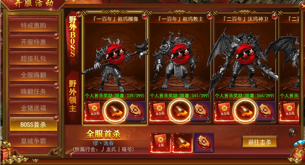 全服首次击杀指定boss即可领取丰厚奖励一份,个人首杀可在领取一份,数量有限,先杀先得。