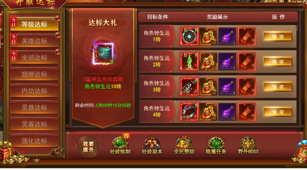 新服前6天每天开启不同的达标活动,活动持续6天,完成达标即可领取丰厚奖励。