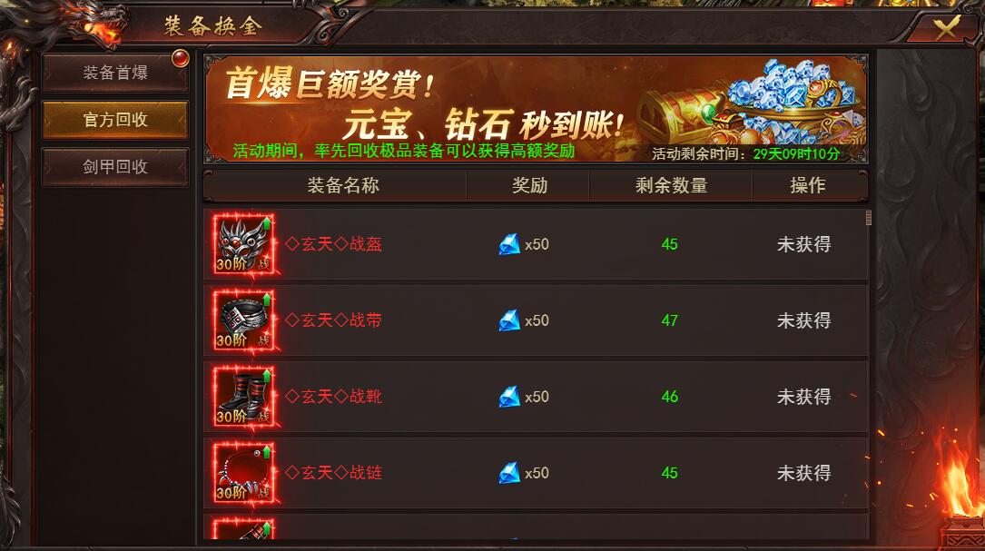 活动期间,率先击杀怪物爆出装备即可领取高额奖励,官方回收剑甲回收更有钻石奖励。