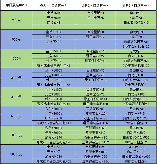 2、单日充值满足的对应档次礼包只可申请一个,只能领取一个档次,不多档位叠加或重复领取。玩家收到礼包后在游戏内选择想要的道具,选错不处理;