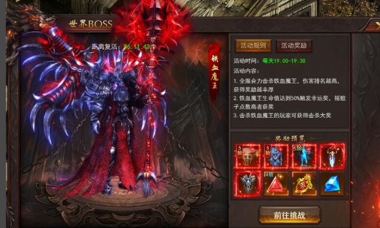 全服合力击杀世界boss-铁血魔王,伤害排名越高,获得奖励越丰厚。