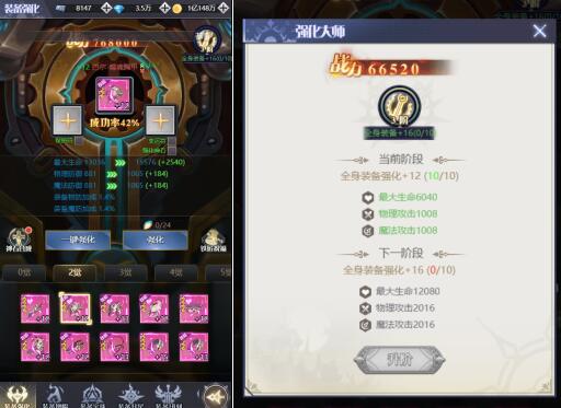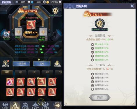 装备增幅可以获得装备百分比加成,增幅需要消耗装备增幅石,增幅时有几率失败,使用幸运符可以增加增幅成功率,使用增幅神石可以百分百成功增幅,使用保护符可以保护增幅失败不掉级。每觉装备都可以单独进行增幅升级,当前觉全部装备达到一定等级可以激活增幅大师额外获得属性加成。