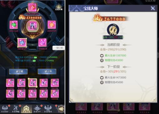 装备宝珠分为5种-泰坦血脉宝珠、物抗宝珠、命中宝珠、回避宝珠、物爆宝珠,每觉每件装备都可以镶嵌这5种宝珠。宝珠可以消耗3个低级宝珠升级为高一级宝珠,也可以分解为1级宝珠,消耗对应数量升级更高级宝珠,每件装备宝珠达到一定等级可以激活宝珠大师获得额外属性加成。