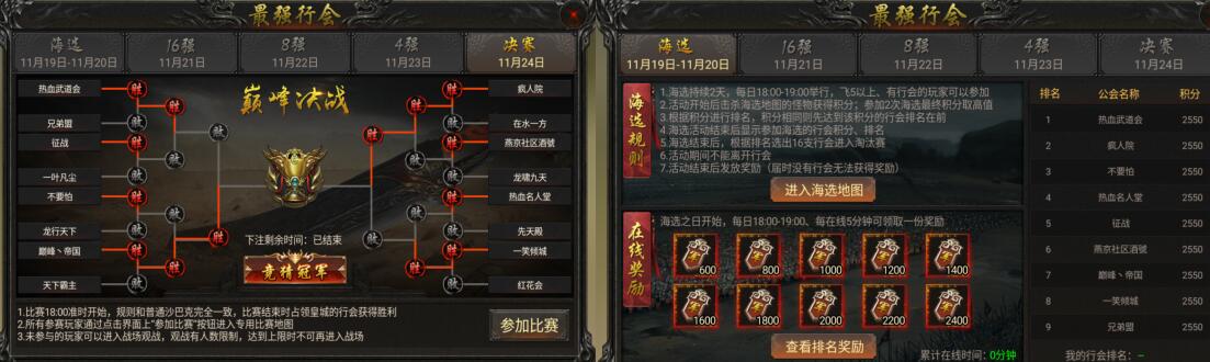 1、活动前两天,行会进行海选,玩家需要击杀海选地图的怪物获取积分,参加2次海选最终积分取最高值