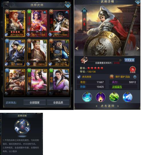 武将按兵种分为三种:弓兵武将、步兵武将和骑兵武将;弓兵武将只能统帅弓兵出战,步兵武将只能统帅步兵出战,骑兵武将只能统帅骑兵出战;弓兵克制步兵,步兵克制骑兵,骑兵克制弓兵;兵种克制会造成额外伤害,合理排兵布阵才能以少胜多。