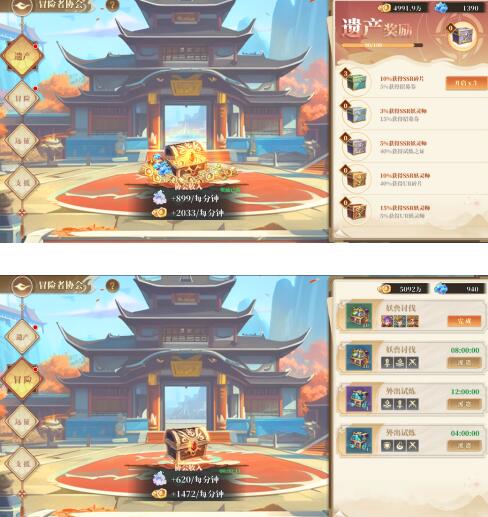 点击“冒险协会”按钮进入冒险协会界面,可开启获得的遗产宝箱、领取额外的协会收入、派遣妖灵师进行任务委派等操作。