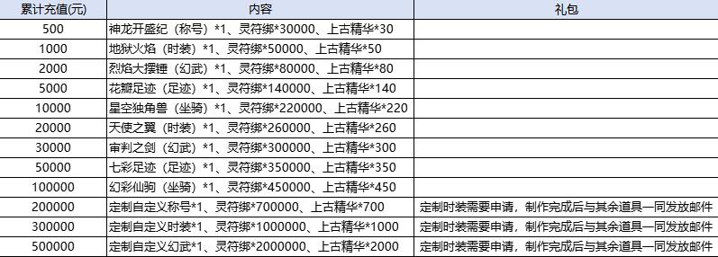 3.活动以单个角色的总累计充值参与,每个角色每个累充档位限领取一次,领取所有档位的奖励,活动自动结束