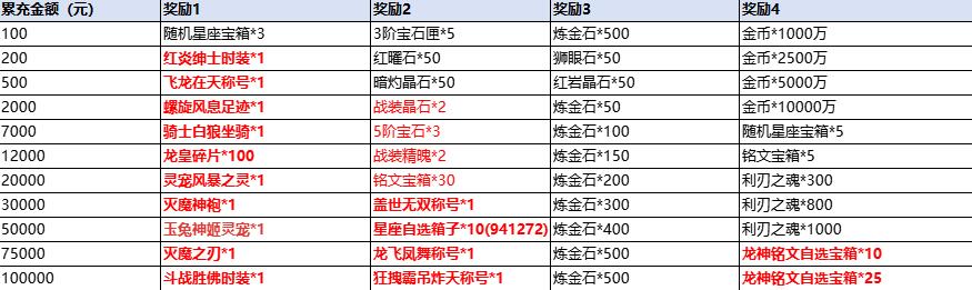 活动规则:从创角时开始计算,总累充返利每个档次奖励终身仅可领取1次