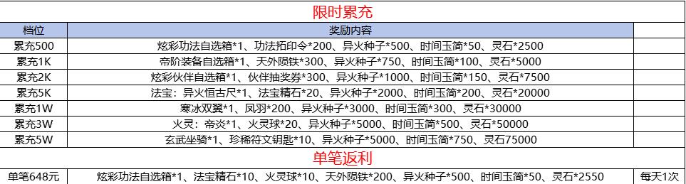 3、单笔648返利玩家单笔充值大于等于648元即可领取奖励,活动时间内每天最多领取一次