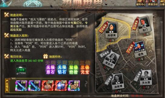 通过消耗神秘卷轴进入热血世界,热血世界共设六大地图,击杀每张地图内的BOSS获取不同的新奇时装,羽翼翅膀,光环,跟宠,符文,足迹。