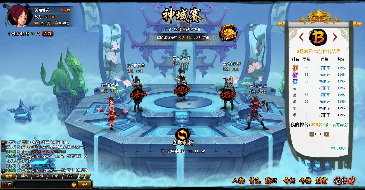 1、每天12点、18点系统免费刷新5个对手,也可花费元宝刷新对手