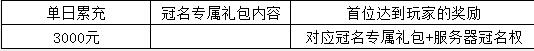 (1)新区开服首日达到额度,即可获取【冠名专属礼包】奖励,首位玩家可以获得服务器冠名权,其余玩家可获得冠名礼包*1