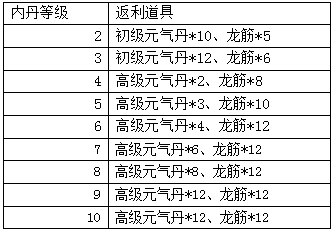 活动规则:活动期间,在刷新内丹重铸系统每消费800元宝即可获得高级元气丹*3奖励!