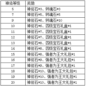 活动规则:活动期间,将任意装备神佑提升到指定等级,可获得额外系统赠礼。