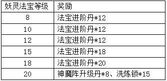 活动规则:活动期间,将灵戒洞天里任意妖灵法宝等级提升到指定等级,可获得额外系统赠礼。