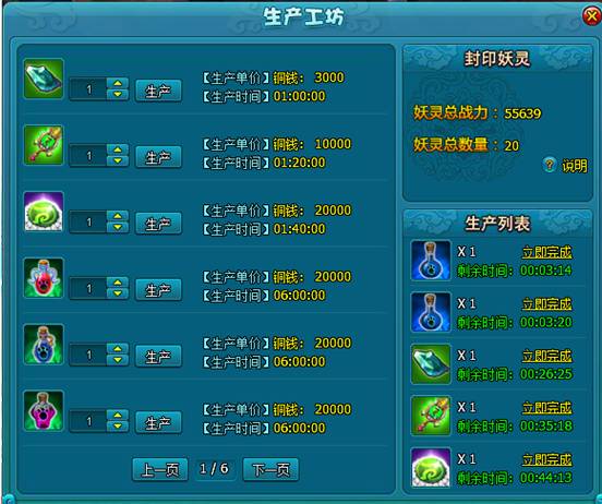 点击生产工坊,即可打开生产面板。消耗相应的铜币与时间即可生产道具,消耗的时间与已激活的所有妖灵战力相关,战力越高,生产时间就越短。