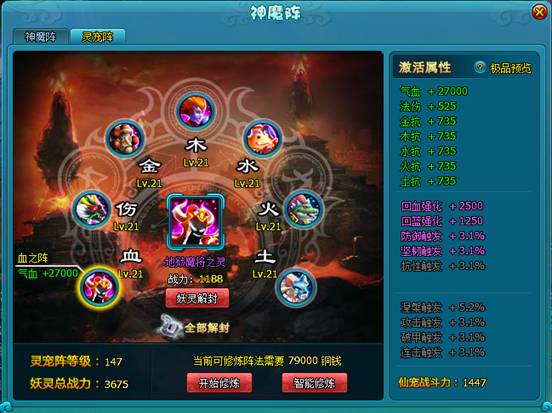 (2)灵宠阵中拥有隐藏的附加属性,当封印于灵宠阵的妖灵总战力达到要求时,便可激活对应的隐藏属性。隐藏属性高低与灵宠阵总等级相关。