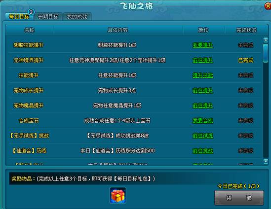 1.每天玩家会有10个目标,只要任意完成其中3个目标即可领取【每日目标大礼包】