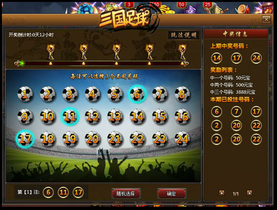 新增趣味系统《三国足球》玩家70级完成冲阵战许褚(3)可以开启三国足球系统。玩家可以自由选择24个足球号码中的其中3个,也可以随机选择。如果所选号码与系统一致则按照规则获得奖励。每消耗1元宝等于1积分,积分达到对应奖励值可以获得珍惜道具。