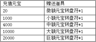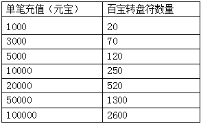 活动期间,玩家充值至指定额度,即可获得对应的元宝转盘符,使用元宝转盘符转动转盘,将可随机获得转盘上任意额度的元宝奖励。每个额度转盘只能转一次,每一轮转完之后将开启下一轮转盘。元宝转盘升级后,最高可累计获得30520非绑定元宝返利哦!