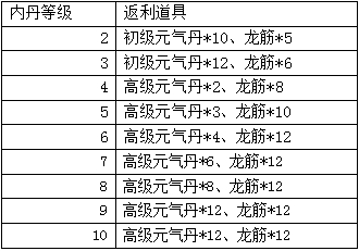 活动规则:活动期间,在刷新内丹重铸系统每消费800元宝即可获得高级元气丹*3奖励!