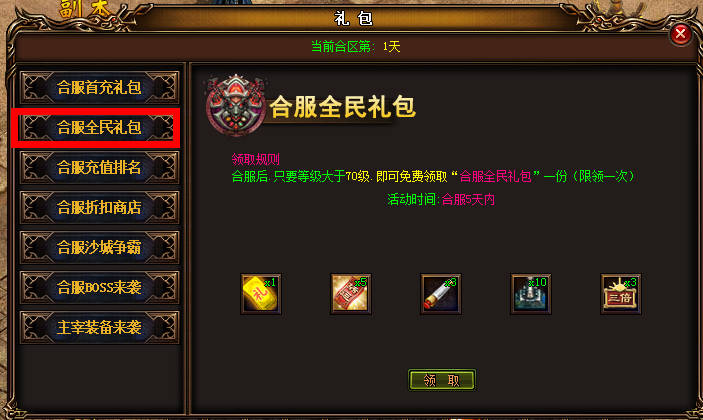 合服后.只要等级大于70级.即可免费领取“合服全民礼包”一份(注:每人限领一次)