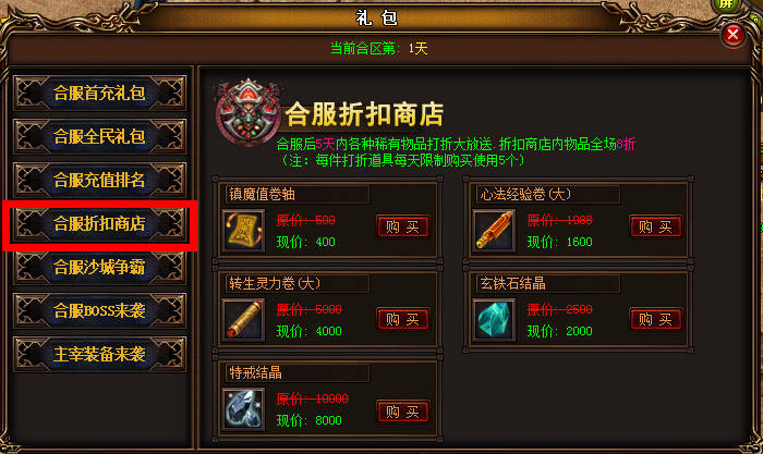 合服后.5天内各种稀有物品打折大放送.折扣商店内物品全场8折 (注:每件打折道具每天限制购买使用5个)