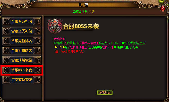 合服后.5天内终极BOSS麒麟祥瑞兽王将在每天15:45 20:45分刷新在土城(62.66) 击杀麒麟祥瑞兽王有几率掉落麒麟首饰 各种高级道具 礼券(注:活动时间总共5天)