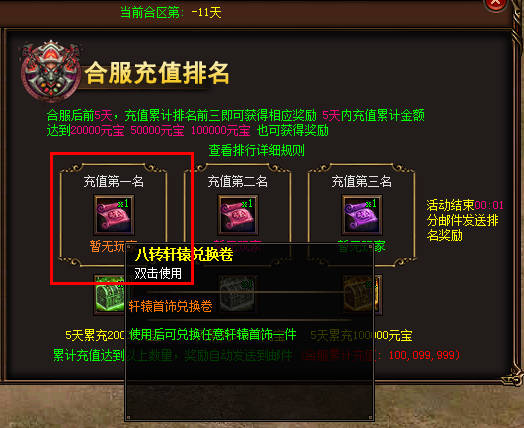 合服后前5天,充值累计排名前三即可获得相应奖励 5天内充值累计金额达到20000元宝 50000元宝 100000元宝也可获得奖励 (注:前三名的充值金额不得低于100000元宝.合服前的充值不计算在内.活动排名按照5天内充值总数排名.前三名玩家可在第6天到该活动面板领取充值排名奖励.5天累计充值奖励.只要金额达到即可领取)