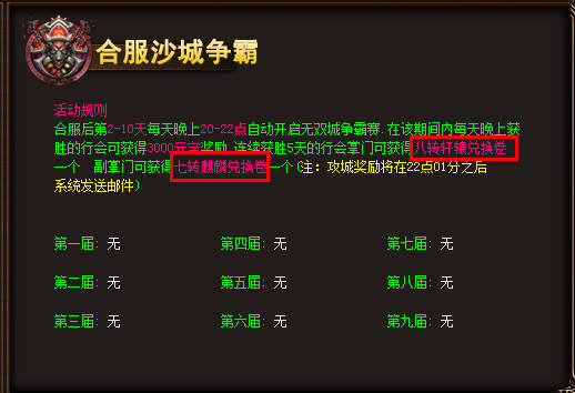 合服后.第2-10天每天晚上20-22点自动开启无双城争霸赛.在该期间内每天晚上获胜的行会可获得元宝3000的奖励.连续获胜5天的行会掌门可获得 八转轩辕兑换卷 一个 副掌门可获得 七转麒麟兑换卷 一个 (注:攻城奖励将在22点01分之后系统发送邮件)