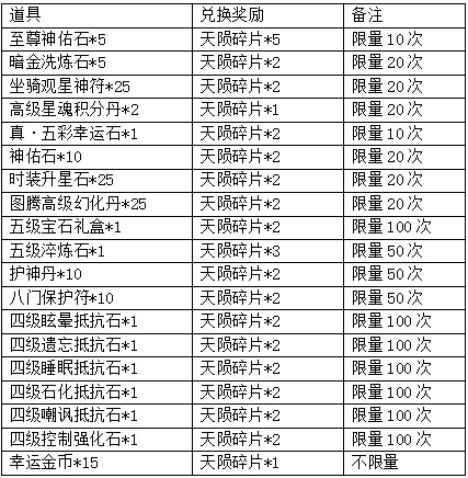 兑换列表如下: