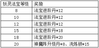 活动规则:活动期间,将灵戒洞天里任意妖灵法宝等级提升到指定等级,可获得额外系统赠礼。