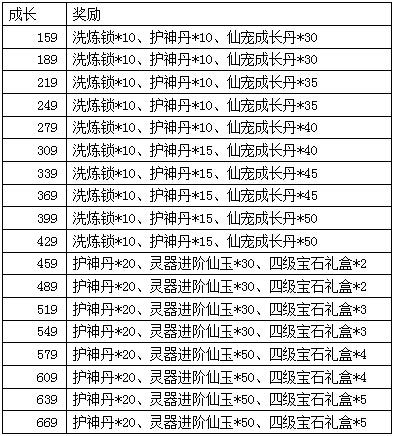 活动规则:活动期间,将仙宠提升至指定成长可获得额外奖励。