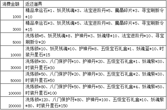 活动规则:活动期间,玩家在除市场外其他全部系统累积消费至指定额度,可获得额外的奖励。