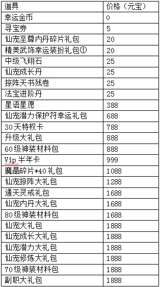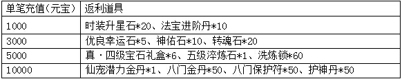 活动期间,所有玩家首次充值任意金额,即可获得价值1088元宝的首充奖励:中级星魂积分丹*2、20元宝抵用券*1、灵幻石*2、鉴宝符*2、四级淬炼石*1、时装升星石*2、守望幸福*1(奖励每人只能领取一次,未进行过首充的玩家还可额外获得【首充礼盒】哦)。